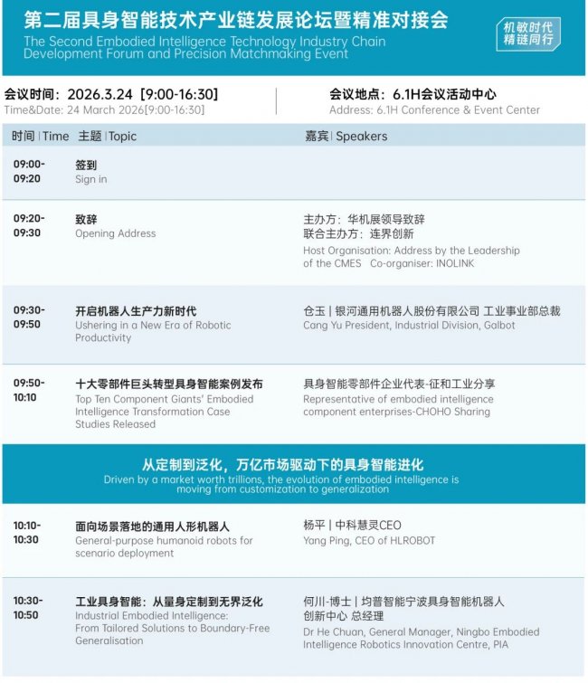 CMES华机展 | 上海国际工业自动化及机器人展开展时间为3月23-26日,同期举办第二届具身智能产业链发展论坛暨精准采购对接会仅限3月23-24日(23日下午对接会&高层晚宴,24日全天具身智能大会),如您有参观或参会需求,请提前领取相关门票及出行时间,期待与您相见~